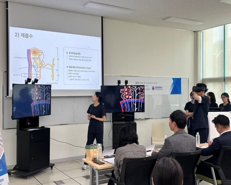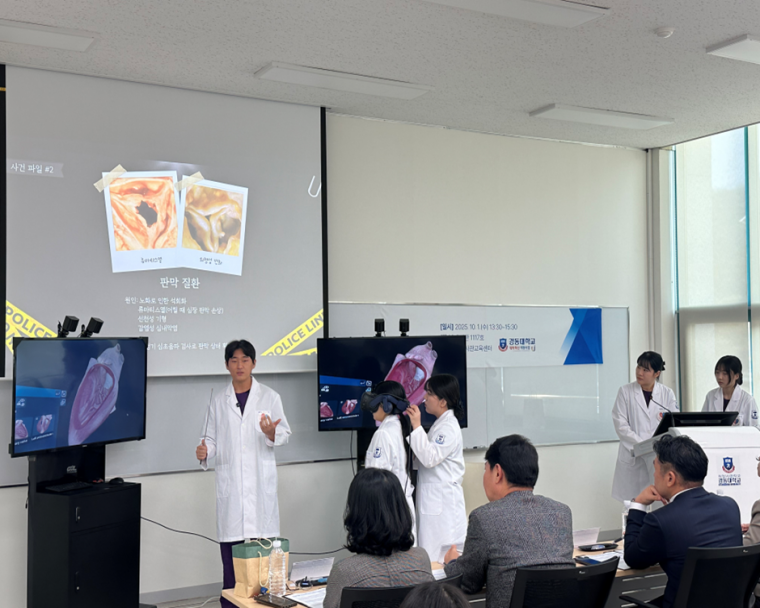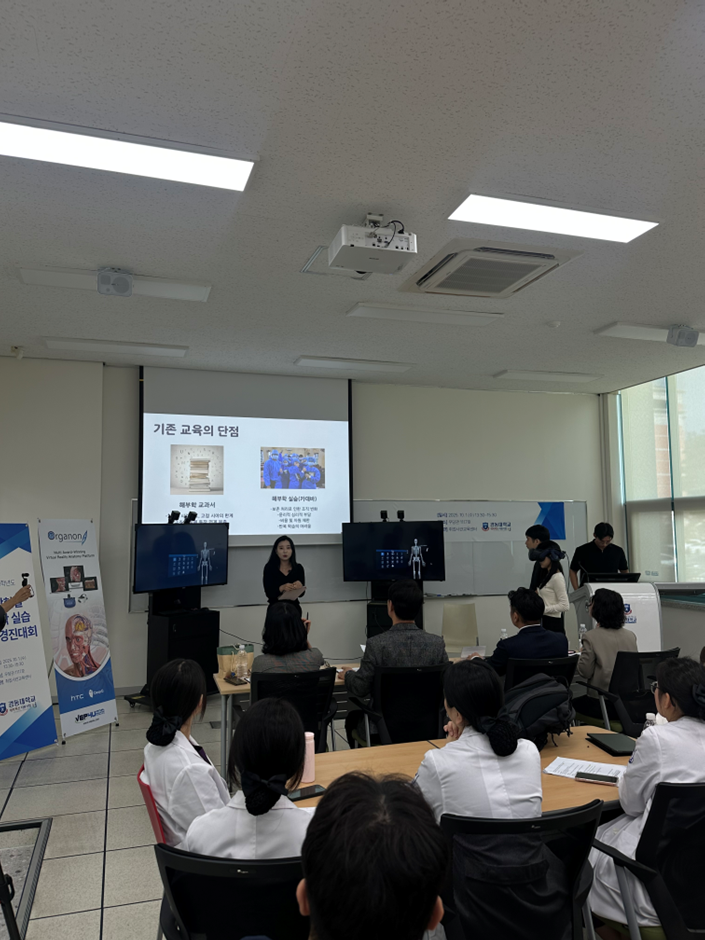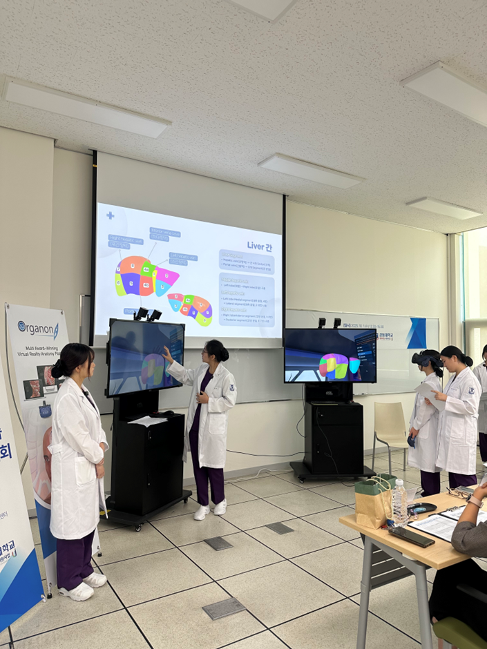 일자: 2025년 10월 01일 수요일 장소: 경동대학교 경동대학교에서 가상현실 해부학실습 시연 경진대회를 개최하였습니다. 이번 경진대회에는 8개의 간호,의료,보건계열 학과의 22개 팀 100여 명이 참여했고, 6개 팀이 수상하였습니다. 지난 해보다 많은 학생들이 참여하여, 교내에 가상현실 활용이 전반적으로 확산되었음을 확인할 수 있었습니다. *3D Organon XR Anatomy (XR기반 해부학 프로그램)