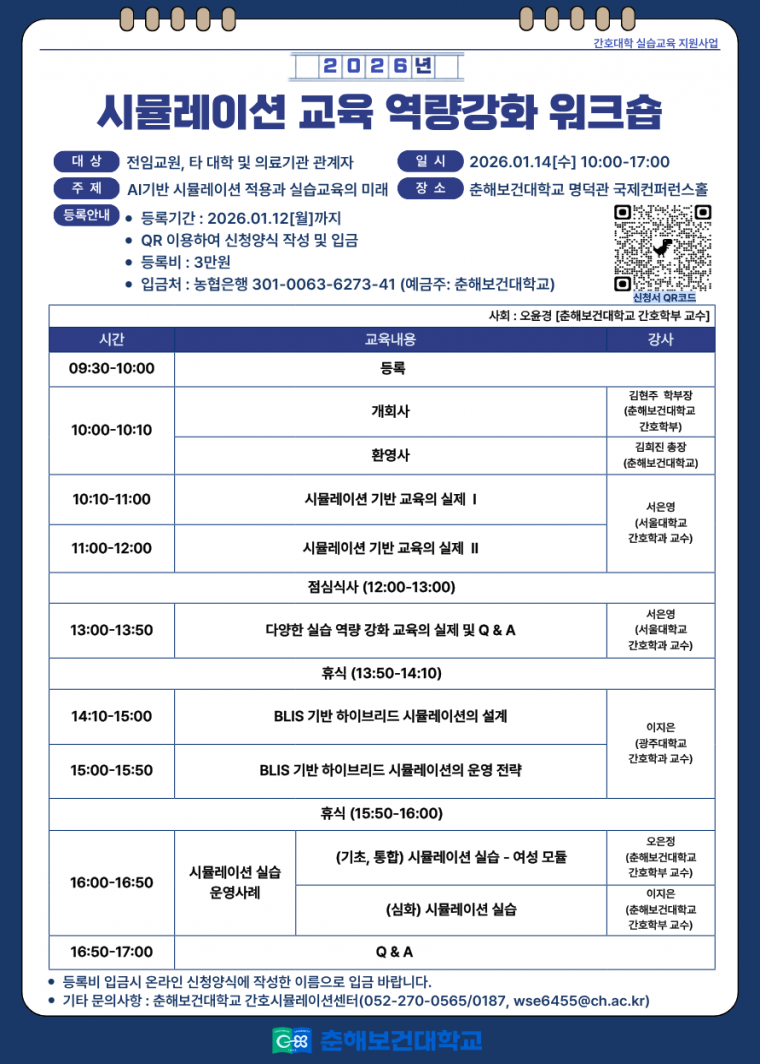 장소 : 춘해보건대학교 명덕관 국제컨퍼런스홀 일시 : 2026.01.14 수요일 10:00 ~ 17:00 *Virti - AI Virtual Humans (Generative AI & Chat GPT) *BLIS (Blended Learning Interactive Simulation) 춘해보건대학교에서 "AI 기반 시뮬레이션 적용과 실습 교육의 미래" 에 관한 주제로 워크숍이 개최되었습니다. 해당 워크숍에서 부스 운영 및 교수님들의 많은 관심을 받았습니다.